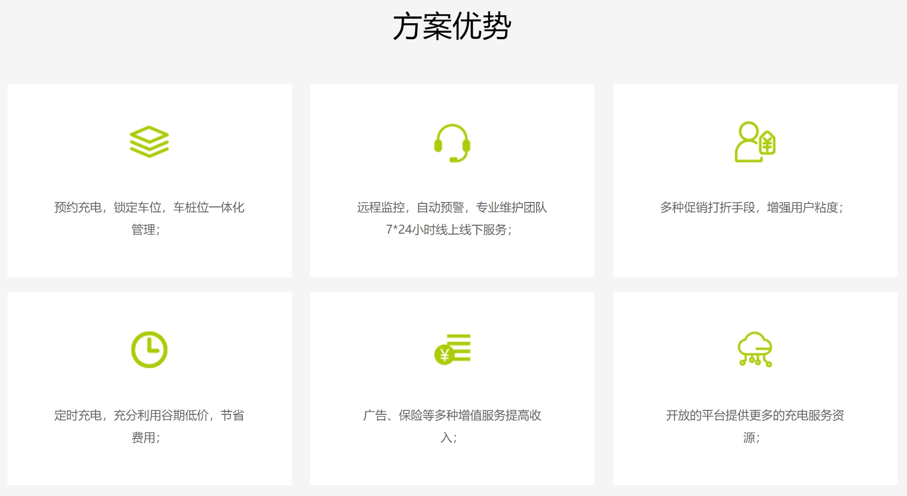 住宅小區(qū)充電具有停車充電時間長,谷期充電需求大和運(yùn)營關(guān)聯(lián)單位多的特點(diǎn),充電云平臺將充電服務(wù)與停車管理、安全監(jiān)控系統(tǒng)相結(jié)合,提供車樁位一體化的管理服務(wù);同時提供了預(yù)約充電和定時充電服務(wù),解決了小區(qū)停車難和谷期充電的需求。 物流、出租公共充電站 針對物流車和出租車流動性大、補(bǔ)電急的特點(diǎn),通過充電云平臺的開放能力提供更廣泛的充電資源,電動車主可通過APP或公眾號,查找附近大功率直流充電設(shè)備為主的公共充電站進(jìn)行快速補(bǔ)電。同時提供了預(yù)約充電服務(wù),減少充電等待時間,實(shí)現(xiàn)場站有序充電;通過云平臺提供的動力、安防監(jiān)控系統(tǒng),專業(yè)維護(hù)團(tuán)隊7*24小時線上線下服務(wù),實(shí)現(xiàn)場站無人值守自動化運(yùn)營。 公交專用充電站 基于充電云平臺開放架構(gòu),與車輛運(yùn)營調(diào)度平臺、場站停車管理平臺完美融合,實(shí)現(xiàn)公交科學(xué)排班輪充的全自動化處理;研發(fā)專屬公交充電場景應(yīng)用,負(fù)荷臨調(diào),群控群充,定時充電”優(yōu)化充電業(yè)務(wù)流程、實(shí)現(xiàn)谷期充電降本,多源數(shù)據(jù)分析”為企業(yè)提供多維度運(yùn)營、運(yùn)維、財務(wù)、質(zhì)量、服務(wù)數(shù)據(jù)分析、助力提升運(yùn)營效率; 還有更多能源云服務(wù)助力打造綜合性公交充電運(yùn)營體系。 商業(yè)地產(chǎn)充電 商業(yè)地產(chǎn)充電具有停車充電時間長,谷期充電需求大和運(yùn)營關(guān)聯(lián)單位多的特點(diǎn),充電云平臺將充電服務(wù)與停車管理、安全監(jiān)控系統(tǒng)相結(jié)合,提供車樁位一體化的管理服務(wù);同時提供了預(yù)約充電和定時充電服務(wù),解決了停車難和谷期充電的需求。 政府公共充電設(shè)施 基于充電云平臺開放架構(gòu),與車輛運(yùn)營調(diào)度平臺、場站停車管理平臺完美融合,實(shí)現(xiàn)公交科學(xué)排班輪充的全自動化處理;研發(fā)專屬公交充電場景應(yīng)用,“負(fù)荷臨調(diào),群控群充,定時充電”優(yōu)化充電業(yè)務(wù)流程、實(shí)現(xiàn)谷期充電降本,“多源數(shù)據(jù)分析”為企業(yè)提供多維度運(yùn)營、運(yùn)維、財務(wù)、質(zhì)量、服務(wù)數(shù)據(jù)分析、助力提升運(yùn)營效率; 還有更多能源云服務(wù)助力打造綜合性公交充電運(yùn)營體系。