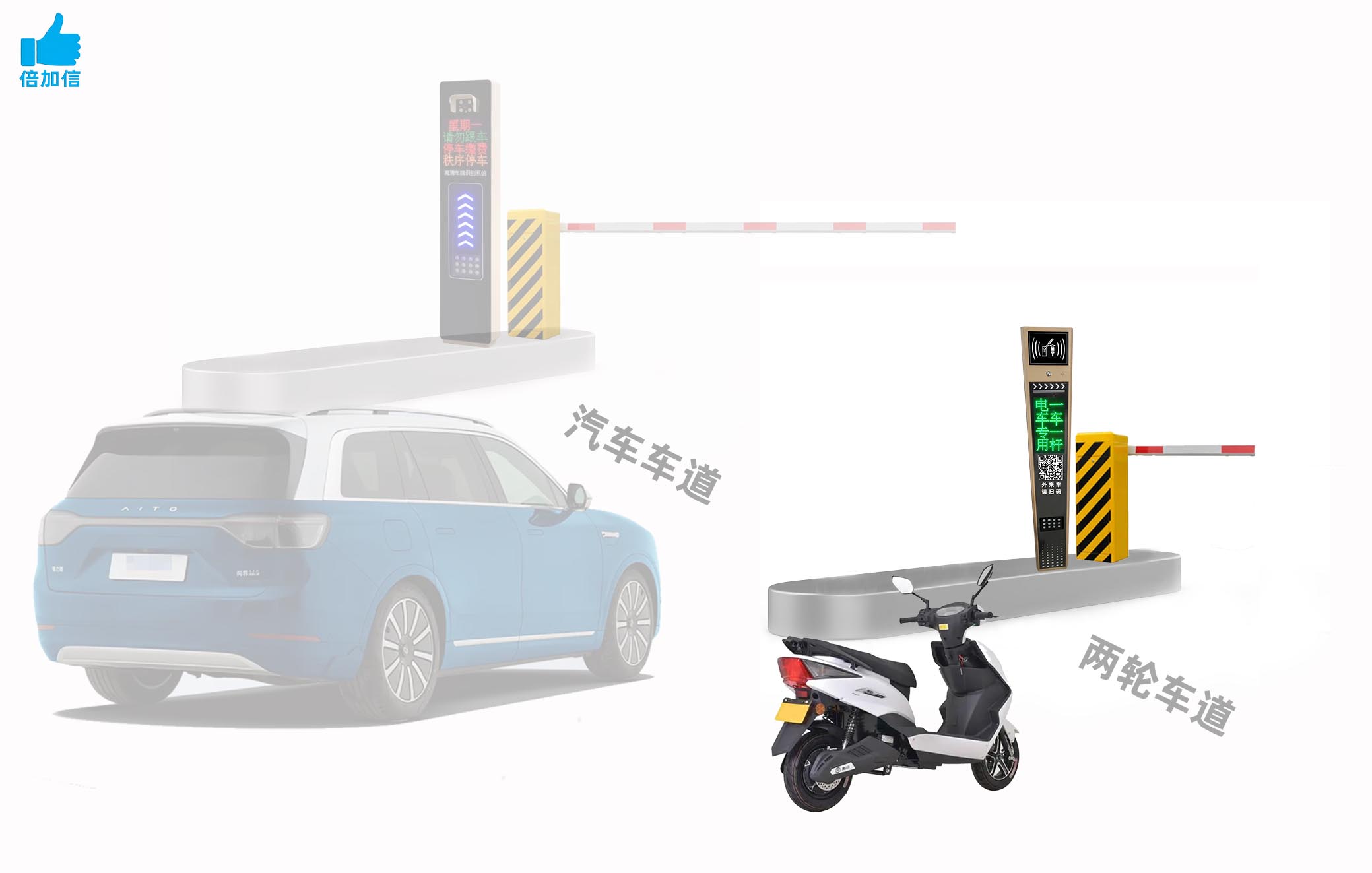 倍加信兩輪電動(dòng)車識(shí)別一體機(jī),支持直接刷充電IC卡,作為固定車輛進(jìn)出,外來車輛掃掃碼入場(chǎng)和繳費(fèi)出場(chǎng)。